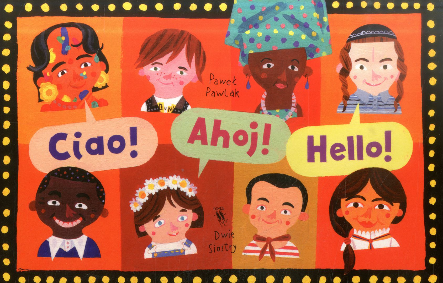 Słowo "Cześć" w różnych językach, również migowym.