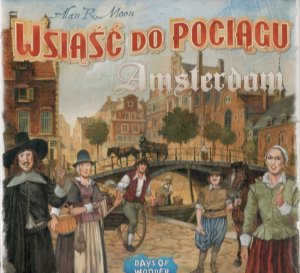 Wsiąść do pociągu : Amsterdam / autor gry: Alan R. Moon ; ilustracje: Julien Delval ; opracowanie graficzne: Cyrille Daujean ; tłumaczenie: Monika Żabicka. - Gdańsk : Rebel Sp. z o.o., [2021]. - 1 pudełko (plansza przedstawiająca sieć handlową w Amsterdamie, 64 plastikowe wozy - po 16 w każdym kolorze, 44 karty Lokomocji, 24 karty Kontraktów, 16 bonusowych kart Towarów, 4 znaczniki punktacji, instrukcja) : ilustracje ; 24x24x5 cm.