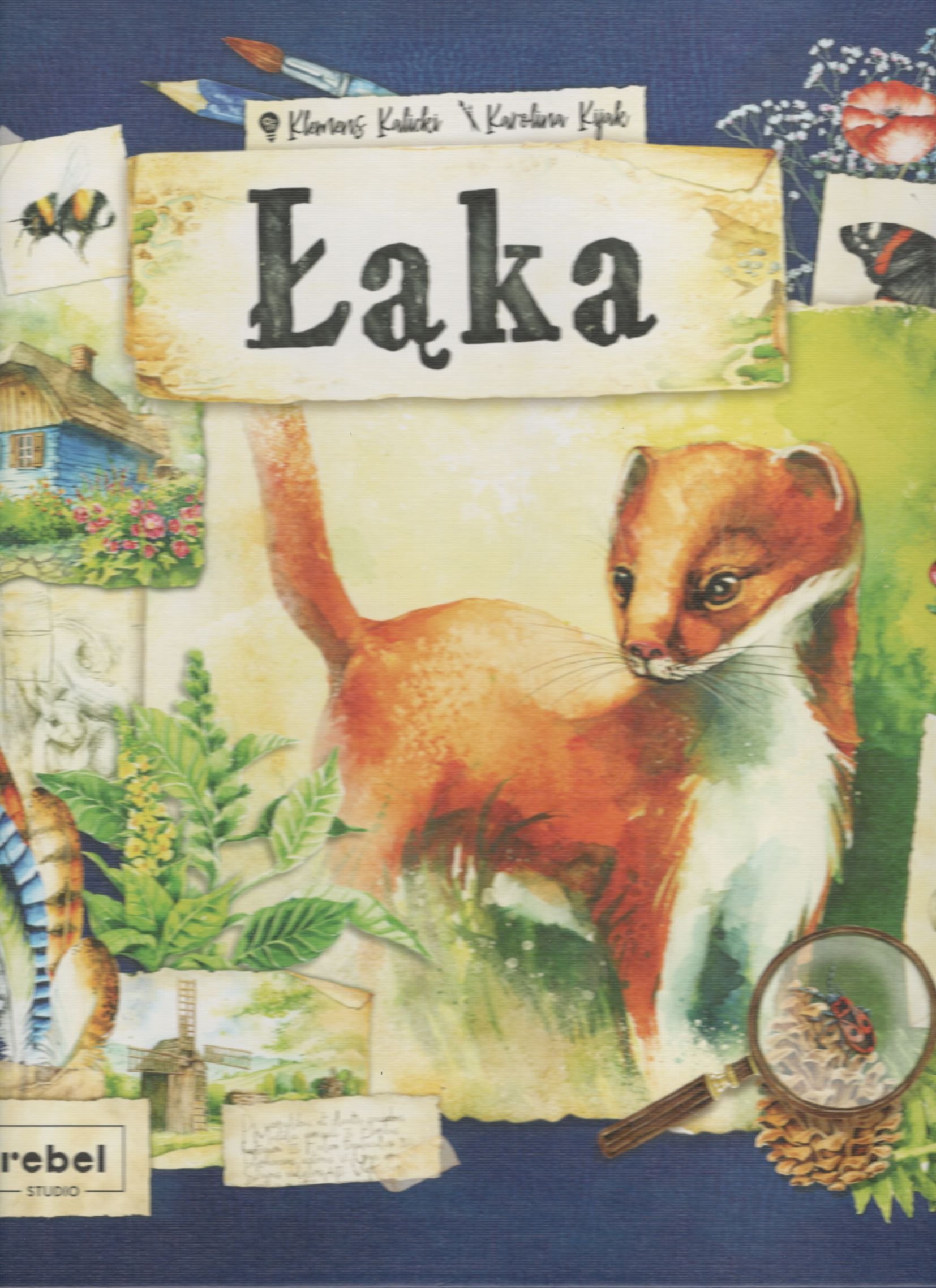 Łąka / [autor gry:] Klemens Kalicki ; [ilustracje:] Karolina Kijak. - Wydanie pierwsze. - Gdańsk : Rebel Sp. z o.o., 2021. - 1 pudełko (plansza główna, 2 plansze ognisk i 2 zaślepki, 184 karty, 12 żetonów celów, 20 żetonów szlaków, 12 żetonów premii, 28 żetonów dróg, żeton wariantu 1-osobowego, żeton pierwszego gracza, 5 kopert z dodatkowymi kartami, znacznik rundy, 4 znaczniki kolorów, 4 składana podajniki, instrukcja, indeks kart, schemat składania podajników, instrukcja) : ilustracje ; 29x29x8 cm.