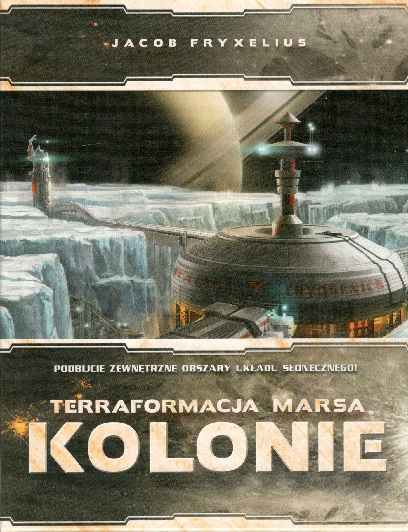 Terraformacja Marsa : kolonie / Jacob Fryxelius ; grafika Isaac Fryxelius ; tłumaczenie: Marcin Wełnicki. - Gdańsk : Rebel, [2018]. - 1 pudełko (49 kart projektów, 5 kart korporacji, 11 kafli obiektów, kafel pomocy, kafel flot handlowych, 8 flot handlowych, 8 znaczników obiektów, instrukcja) : ilustracje ; 24x19x5 cm.