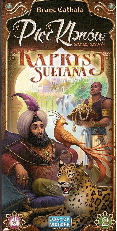 Pięć Klanów : kaprysy sułtana : rozszerzenie / projekt gry Bruno Cathala ; ilustracje Clément Masson ; opracowanie graficzne Cyrille Daujean. - Gdańsk: Rebel Sp. z o.o., © 2021. - 1 pudełko (6 płytek, 15 drewnianych figurek członków klanów, 8 wielbłądów, namiot, znacznik gracza, 22 karty kaprysów sułtana, 2 karty dżinów, tor licytacji i tor kolejności, noteks z akruszami punktacji, instrukcja, 5 arkuszy pomocy, 42 żetony złotych monet o wartości "5") ; 30x15x4 cm.
