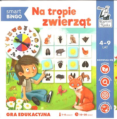 Na tropie zwierząt : gra edukacyjna / redakcja: Izabela Gołaszewska ; ilustracje: Monika Pieczka. - Warszawa : Edgard, © 2021. - 1 pudełko (4 dwustronne plansze, 53 żetony koło do losowania ze wskazówką, pasek zwycięstwa, trofeum zwycięzcy, instrukcja) ; 22x22x5 cm.