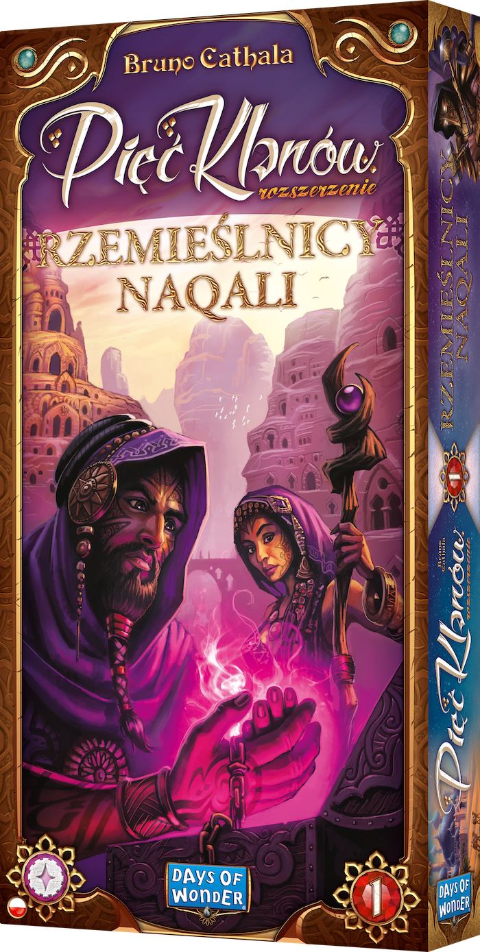 Pięć Klanów : rzemieślnicy Naqali : rozszerzenie / projekt gry: Bruno Cathala ; ilustracje: Clément Masson ; projekt graficzny: Cyrille Daujean. - Gdańsk: Rebel Sp. z o.o., © 2021. - 1 pudełko (6 płytek (3 warsztaty, 2 specjalistyczne targowiska, 1 przepaść), 15 drewnianych figurek członków klanów, 4 namioty, 18 znaczników przedmiotów, 6 pasm górskich, 4 karty dżinów (2 nowe i poprawione), notes z arkuszami punktacji, 4 arkusze pomocy, instrukcja) : ilustracje ; 30x15x5 cm.