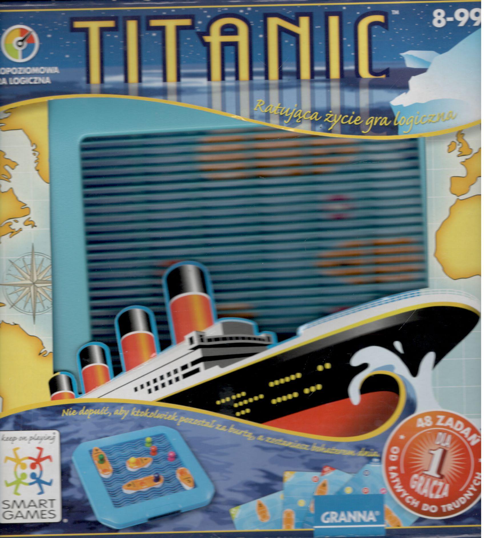 Titanic / designer: Raf Peeters. - Warszawa : Granna, [2011]. - 1 pudełko (1 plastikowa plansza do gry, 6 łodzi ratunkowych, 7 pasażerów, pudełko do przechowywania elementów) ; 24x25x5 cm.
