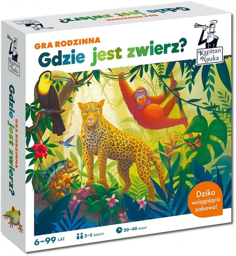 Gdzie jest zwierz? : gra rodzinna / autor: dr Paweł Czapczyk ; redakcja: Hubert Bobrowski ; ilustracje: Anna Truszkowska. - Warszawa : Edgard, © 2022. - 1 pudełko (plansza, 45 kart z pytaniami, 10 kart do gry obserwacyjnej, 5 pionków, kostka, instrukcja) ; 25x25x6 cm.