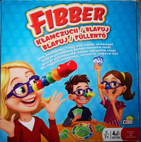 Fibber = Kłamczuch = Blafuj = Blafuj = Füllentö. - Warszawa : Cobi S.A., [2023]. - 1 pudełko (4 okulary, 11 nosków, 1 plansza do gry, 24 karty, instrukcja) : ilustracje ; 27x27x5 cm.