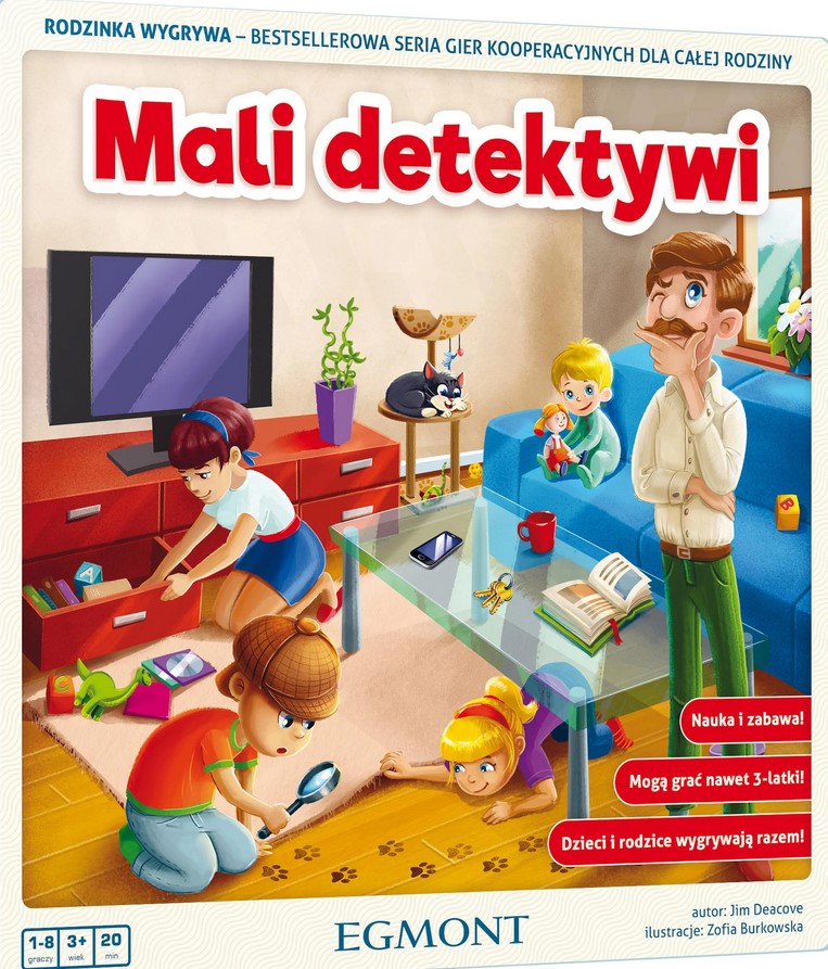 Mali detektywi / autor: Jim Deacove ; ilustracje: Zofia Burkowska. - Warszawa : Egmont, © 2016. - 1 pudełko (plansza, 1 drewniany znacznik skrzyni, 1 nalepka na skrzynię, 1 wskazówka zegara, 12 żetonów zegara, 24 żetony przedmiotów (12 par), instrukcja) ; 26x26x3 cm.