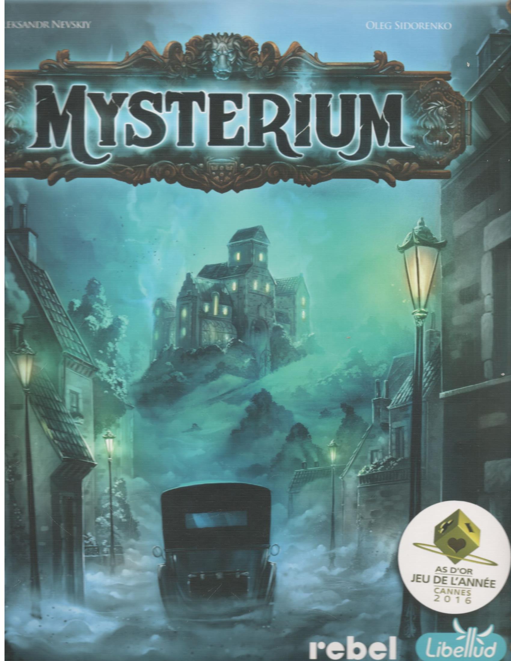 Mysterium / [autorzy] Oleksandr Nevskiy, Oleg Sidorenko ; [ilustracje]: Xavier Collette & Igor Burlakov. - Gdańsk : Rebel Sp. z o.o., [2023]. - 1 pudełko (elementy dla ducha: ekran, 84 karty wizji, 18 kart postaci, 18 kart miejsc, 18 kart przedmiotów, 15 żetonów, klepsydra, elementy dla badaczy: 18 kart postaci, 18 kart miejsc, 18 kart przedmiotów, 42 żetony, 6 pionków, 6 kopert, 4 planszetki postępu, tor jasnowidzenia, planszetka z zegarem, instrukcja) : ilustracje ; 29x29x8 cm.