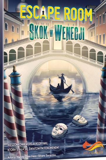 Escape room : skok w Wenecji / autorzy: Martino Chiacchiera i Silvano Sorrentino. - Warszawa : FoxGames, © 2020. - 1 pudełko (60 dużych kart z zagadkami, 1 sekretny plan) : ilustracje ; 16x11x4 cm.