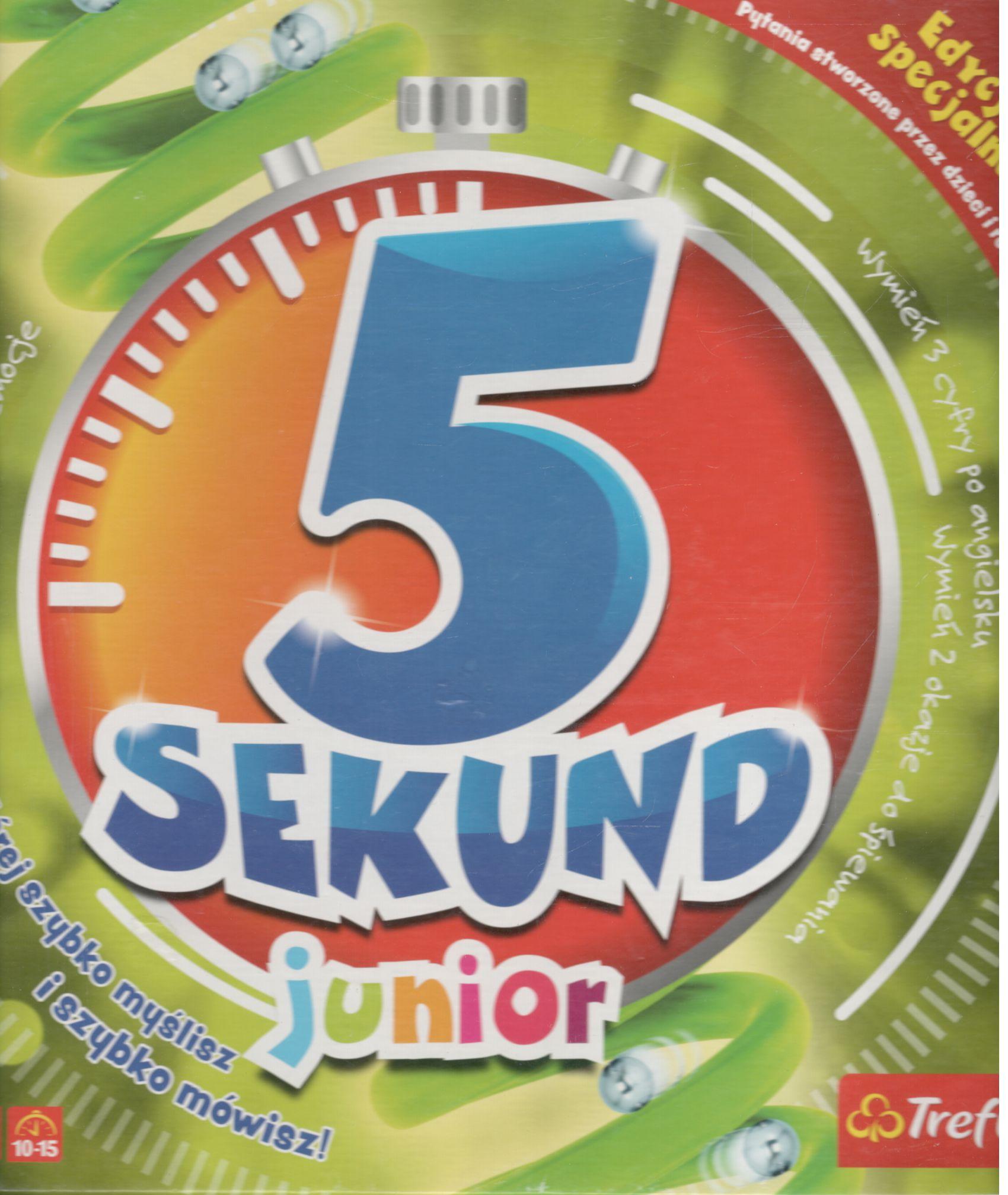5 sekund : junior / opracowanie gry: Paulina Kortas, Adam Bukowski, Jacek Zdybel, Bartosz Odorowicz ; opracowanie graficzne: Sebastian Goyke. - Gdynia : Trefl, [2020]. - 1 pudełko (354 karty z pytaniami (708 pytania), 18 kart "Czas", 18 kart "Zmiana", 6 pionków do gry, 1 plansza do gry, 1 specjalny czasomierz, 1 plastikowe pudełko na karty, instrukcja) ; 26x26x8 cm.