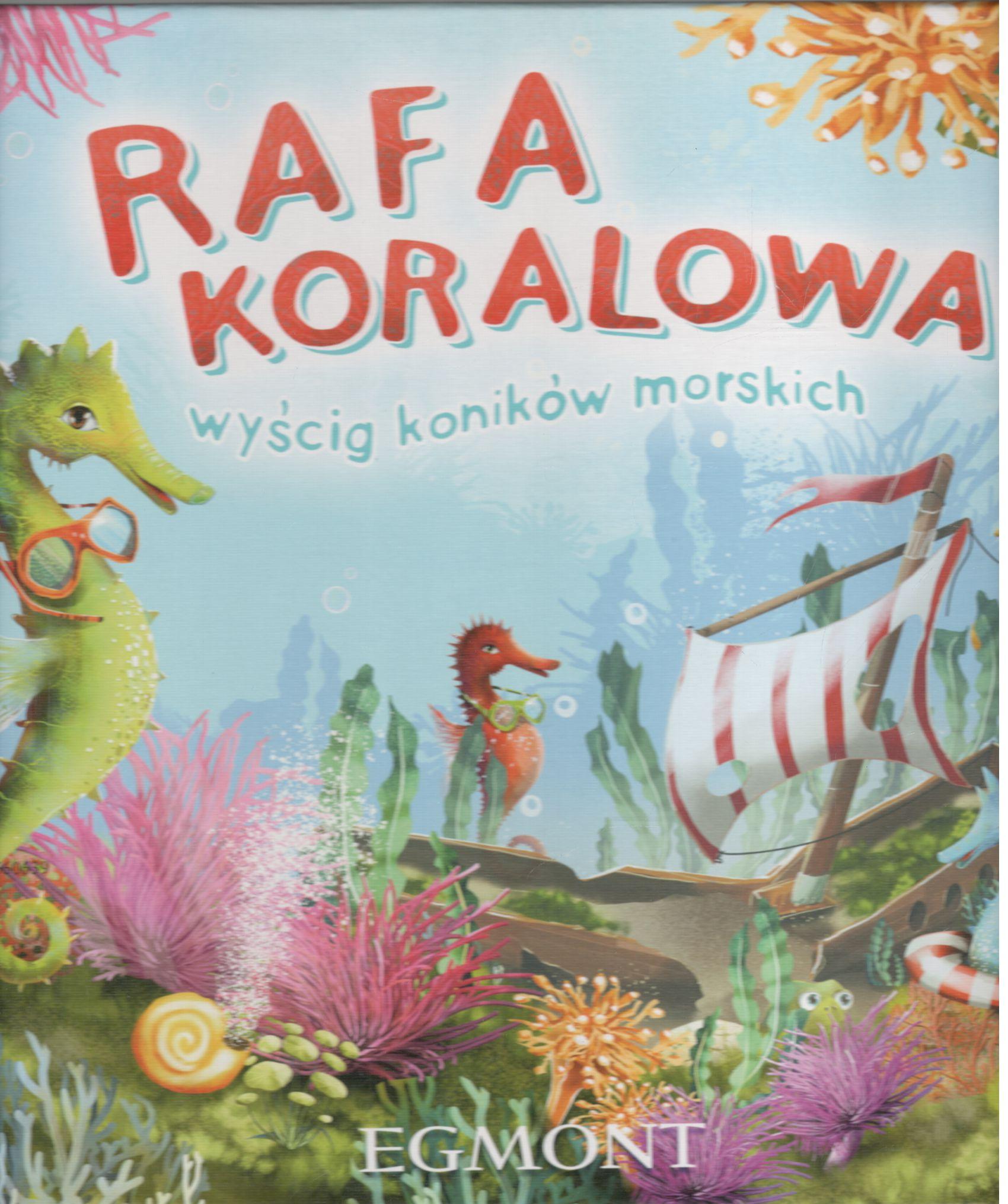 Rafa koralowa : wyścig koników morskich / autor: Przemek Wojtkowiak ; ilustracje: Ewa Kaplarczyk. - Warszawa : Egmont, © 2024. - 1 pudełko (4 drewniane pionki koników morskich - w 4 kolorach graczy, kafel wraku statku, 6 dużych kafli wodnych roślin, 20 kafelków wodnych zwierzątek - po 5 sztuk na gracza w ich kolorach, 4 kafle muszli z białą perłą - po 1 na gracza, 36 żetonów surowców - w 6 rodzajach, woreczek, 15 żetonów akcji) : ilustracje ; 26x26x5 cm.