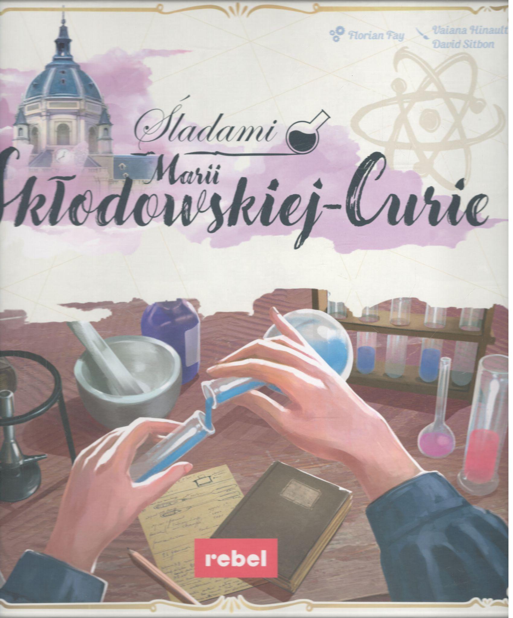 Śladami Marii Skłodowskiej-Curie / Florian Fay ; [ilustracje:] Vaiana Hinault, David Sitbon ; [tłumaczenie: Agnieszka Chrzanowska]. - Gdańsk : Rebel, [2025]. - 1 pudełko (wieża surowców, plansza główna, 4 plansze graczy, 47 kart aktywności, 24 kafelki eksperymentów, 16 kafelków prac naukowych, 5 kafelków celów, 3 kafle pracowni, 54 kostki surowców, 29 żetonów punktów zwycięstwa, kafelek Marii Skłodowskie-Curie, znacznik czasu, znacznik pracowni, znacznik pierwszego gracza, materiałowy woreczek, instrukcja, załącznik) : ilustracje ; 26x26x8 cm.