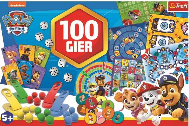 100 gier : Paw Patrol. - Gdynia : Trefl, [2026]. - 1 pudełko (6 dwustronnych plansz, 54 żetony, 16 pionków, 4 katapulty, 55 kart, 6 kości, formatka z otworami, instrukcja) ; 27x40x6 cm.