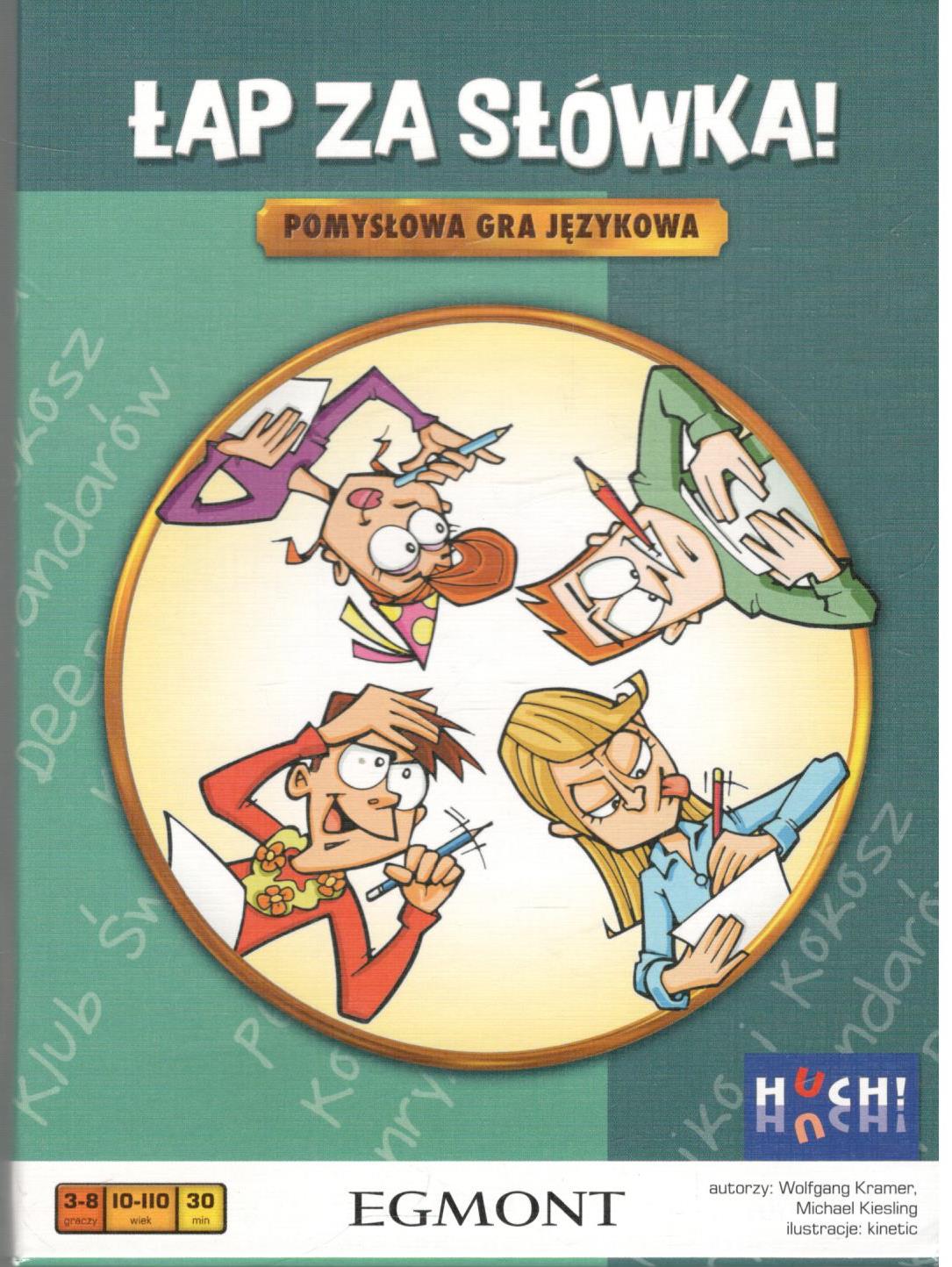 Łap za słówka! : pomysłowa gra językowa / autorzy gry: Wolfgang Kramer, Michael Kiesling ; ilustracje: kinetic ; tłumaczenie: Maciej Nowak-Kreyer. - Warszawa : Egmont, © 2022. - 1 pudełko (48 kart zadań z 480 zadaniami, 48 kart punktów z liczba od 1 do 6 w 8 kolorach, 12 kart utrudnień, 1 karta startu, 1 karta mety, 8 pionków, 1 klepsydra 1 notes, zasady gry) ; 19x14x5 cm.