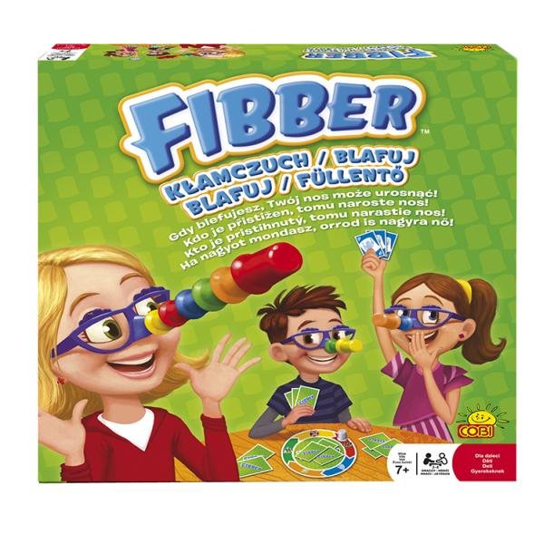 Fibber = Kłamczuch = Blafuj = Blafuj = Füllentö. - Warszawa : Cobi S.A., [2021]. - 1 pudełko (4 okulary, 11 nosków, 1 plansza do gry, 24 karty, instrukcja) : ilustracje ; 17x17x6 cm.