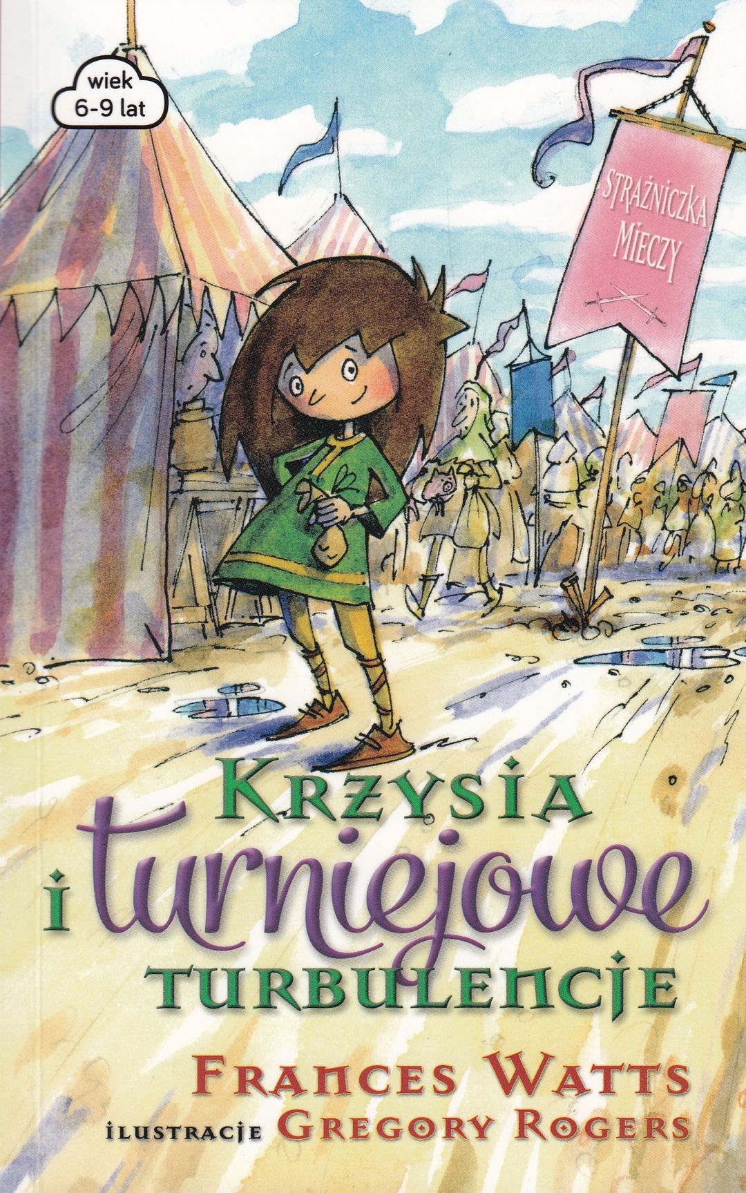 Krzysia bierze udział w turnieju rycerskim. Czy poradzi sobie z nowymi wyzwaniami? Zamek Jutrzenki organizuje turniej rycerski! Kiedy podczas ćwiczeń jeden z giermków zostaje ranny, Sir Benedykt proponuje Krzysi, by zajęła jego miejsce. Jest tylko jeden problem: Krzysia nigdy dotąd nie jeździła konno. Nie dość na tym, za każdym razem piękna Bella zrzuca Krzysię z grzbietu! Czas ucieka… Co w tej sytuacji zrobi Krzysia? Jedno jest pewne - nie podda się. To już trzecia porcja historii o Krzysi, która może śmiało konkurować z Meridą Waleczną albo PiPi Pończoszanką. Krzysia jest pozytywna, zaradna i uczynna. Swoją obecnością zapełnia lukę w literaturze dziecięcej, ale historycznej. Jest dobrą propozycją szczególnie dla tych dzieci, których czytanie nudzi, ponieważ wiszące nad głową pytanie w trakcie lektury: „…i co dalej?” w końcu doprowadzi młodego czytelnika do ostatniej kartki tej opowieści. [lubimyczytac.pl]